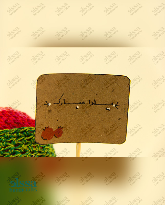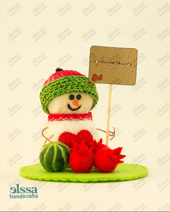 شامل یک آدم برفی کچه کاری شده، سه عدد انار کچه کاری شده ویک عدد هندوانه کچه کاری شده. به همراه یک استند تبریک یلدا.